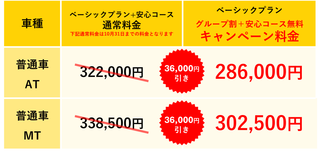 ※安心コース通常料金:30,000円(準中型30歳以下22,000円、普通二種・大特11,000円)